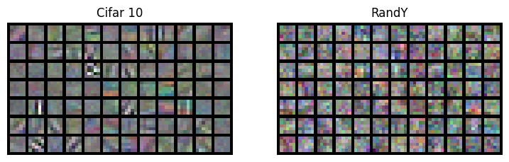 And we are able to see that the filters learned by the network trained on real data are much more structured and seem useful in contrast to the ones learned by training on noise.