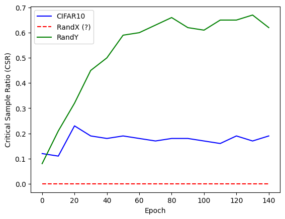 Where we observe roughly the same trend as in the paper displayed above while the network trained on real data has a somewhat constant CSR, the one trained on random labels has a higher CSR as training progresses. However, I could reproduce RandX’s behavior and obtained a constant CSR of 0. I tried different seeds, \(r\), and datasets (training and validation) without luck. My suspicion is that the model’s capacity and thus performance were not high enough (around 10% validation accuracy). I decided to stick with the paper’s architecture and move on.