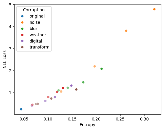 The intuition here, as far as I can tell, is that entropy encodes the model’s confidence. If the model’s prediction is confident, it is all-in-all more probable to be correct (it might have seen similar examples during training, the example might be “easy”, etc). Corruptions take the model OOD and decrease its confidence. Since cross-entropy is lowest when all probability mass is assigned to the correct label, increasing entropy (all-in-all) dilutes that mass and increases loss.