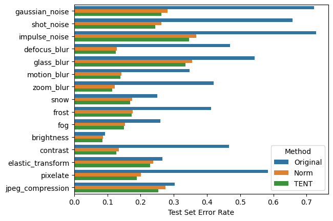 Now for evaluation. While the authors consider other baselines, for simplicity, we only compare TENT against the unadapted source model and a test-time normalization method (“Norm”) which just updates the BN statistics during testing.