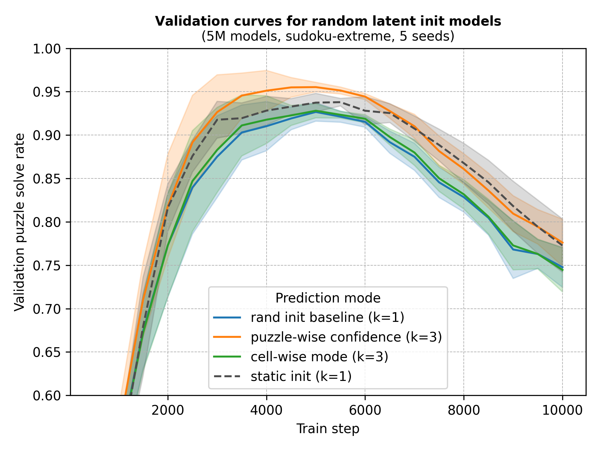 We train networks with random latent inits and use the same forward passes to track the performance of predicting the cell-wise majority vote, keeping the whole puzzle the model is most confident in, and just using one of the forward passes as a baseline. Recycling the forward pass makes this the least noisy experiment we’ll make, since training run-to-run variance is really high. However, we also separately train networks with static latent inits as another baseline.