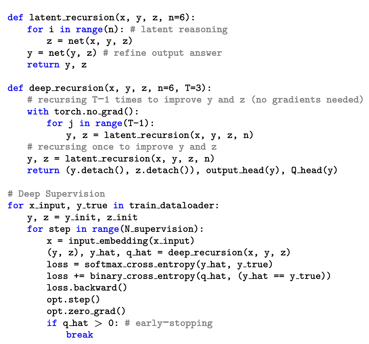 latent_recursionwith gradients. The argument here is that since deep supervision trains the model to be a “local improver”, it should benefit from running a few extra recursions – even without gradients. However, too many recursions without gradients seem to hurt, as Table 3 shows.
